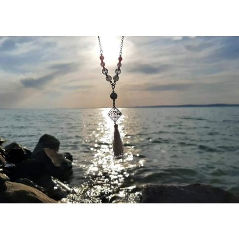 A nyaklánc 4-6-8mm es gyöngyökből készült 50-cm hosszú, nikkelmentes láncon, kapoccsal. Lánchosszabítot kérhetsz rá.