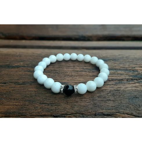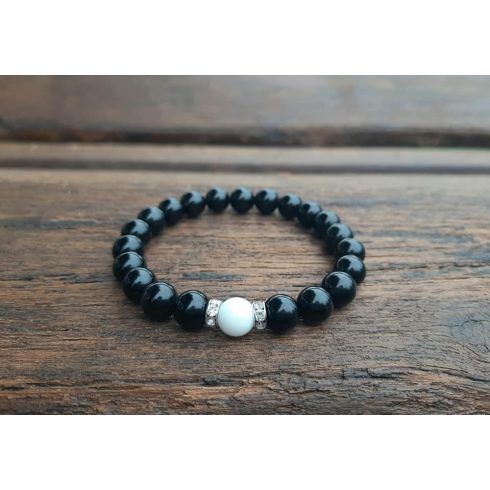 8-mm es gyöngyökből készült, lapos fűzőszálra duplán fűzve.