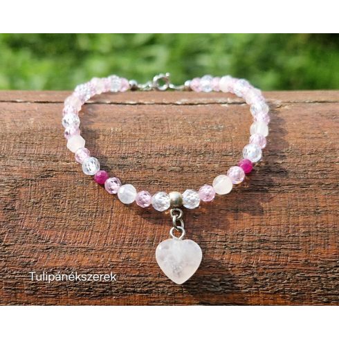 Szerelem- Szenvedély karkötő, Rubin, Cirkon és Rózsakristálybó, Rózsa szivecskével