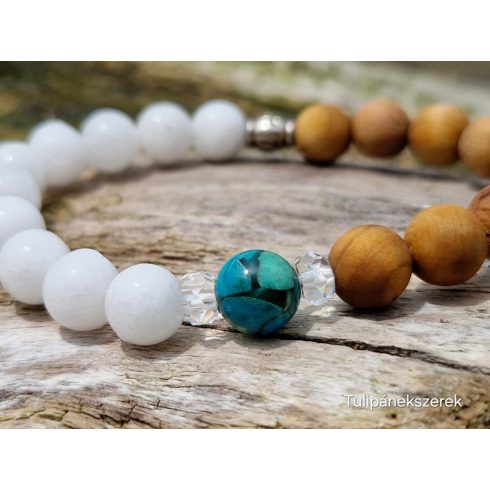 Szabadság karkötő, Krizokolla, Hókvarc, Hegyikristály és Szantálfából, ezüst Tulipángyönggyel