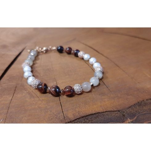 Nap és Hold karkötő, Holdkő, tenyésztett Gyöngy, Macskaszem és Tigrisszem kristályokból, Swarovski kiegészítőkkel.