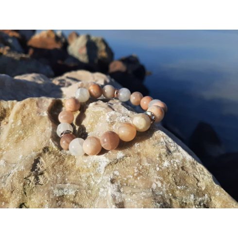 A Holdkő a Nőiesség kristálya. Erősen kötődik a Holdhoz, visszavezet a Hold fényébe és az intuíciók világába. Tudatossá teszi a tudatalattit, fokozza a megérzéseket és az empátiát. Erősíti a nőiességet, segíti a női minőségek megélését. Segít behívni és elfogadni és megélni a szerelmet. Kitűnő ellenszere a szélsőséges helyzeteknek és érzelmeknek. Csillapítja az érzelmi bizonytalanságot és stresszt, valamint stabilizálja az érzelmeket. Fejleszti az érzelmi intelligenciát. Mélyreható érzelmi gyógyulást tesz lehetővé. A Holdkő helyreállítja a menstruációs ciklust, és enyhíti a menstruációval összefüggő rendellenességeket és feszültséget. Enyhíti a változókor tüneteit, hőhullámokat. Kapcsolatban áll a tobozmiriggyel, kiegyensúlyozza a hormonrendszert, a testfolyadékok áramlását, és ráhangol a bioritmus órájára. Elősegíti a mély, nyugodt alvást. Nagy, 10mm es gyöngyökből készült.