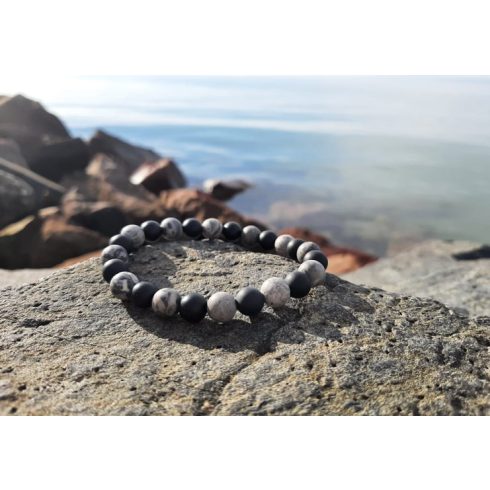 8-mm es gyöngyökből készült, lapos fűzőszálra duplán fűzve.