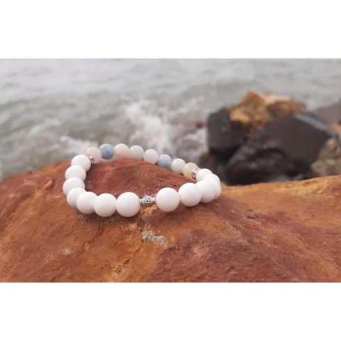 Teljesség Berill karkötő Akvamarin, Morganit, Helidor és Kagylóhéj kristályokból, ezüst Tulipángyönggyel