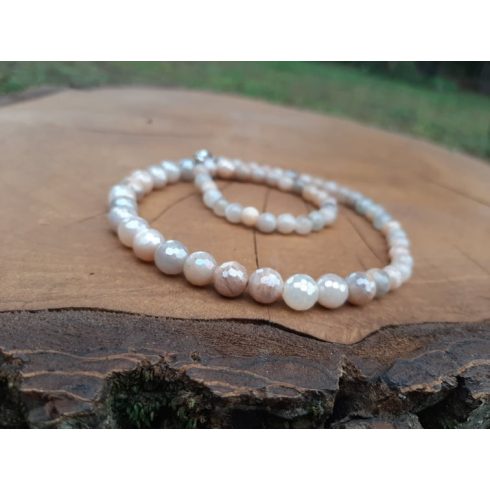A nyaklánc 4-es, 6-os, 8-as-mm es gyöngyökből készült 43-cm hosszú, sodronyra fűzve, nikkelmentes kapoccsal.