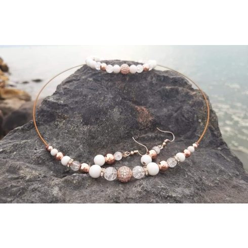 4,6,8 és 10-mm es gyöngyökből készült, a karkötő lapos fűzőszálra duplán fűzve. A nykék merev sodronyláncon, tekerős zárral. A fülbevaló nikkelmentes alapon.