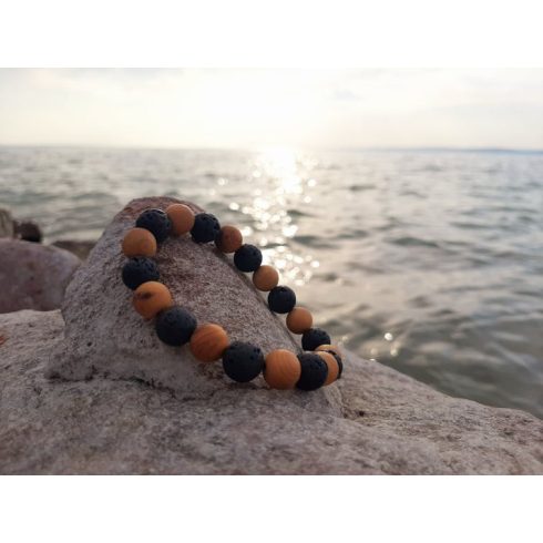 10-mm es gyöngyökből készült, lapos fűzőszálra duplán fűzve.