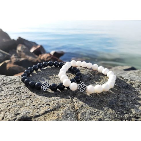 8-mm es gyöngyökből készült, lapos fűzőszálra duplán fűzve.